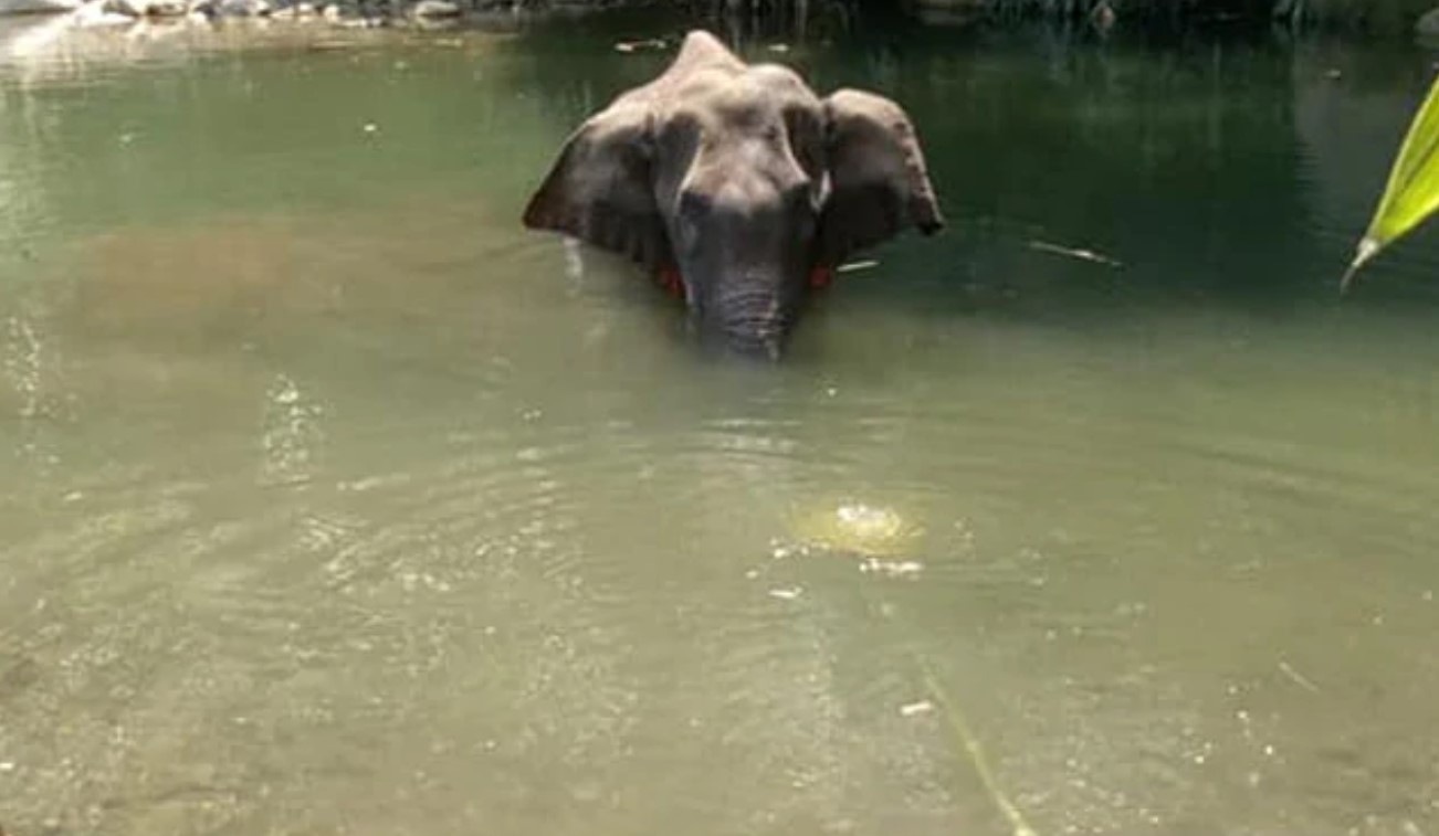 सोशल मीडिया पर शेयर की गई तस्वीरों में हाथी को उसके मुंह में पानी में डुबोते हुए और शायद दर्द से राहत के लिए नदी में खड़ा दिखाया गया है।