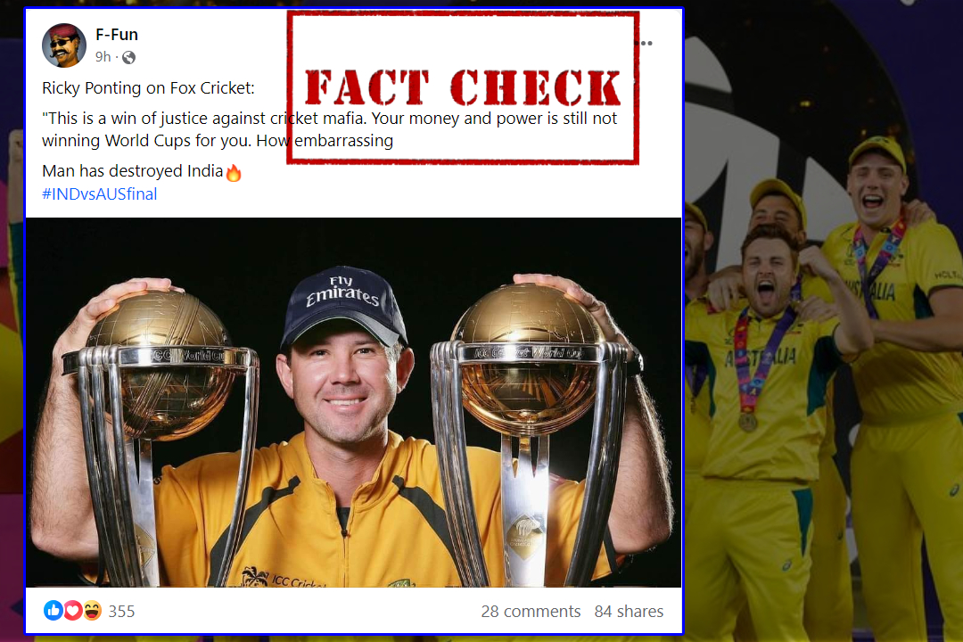 वर्ल्ड कप 2023 के फाइनल में एक बार फिर भारत की उम्मीदों पर पानी फिर गया। भारत ने पहले बल्लेबाजी करते हुए 240 रन का टारगेट दिया। जिसके बाद ऑस्ट्रेलिया ने भारत को 6 विकेट से हराकर छठी बार विश्व कप ट्रॉफी अपने नाम करली। इनसब के बीच ऑस्ट्रेलिया के पूर्व कप्तान रिकी पॉनिटंग से जुड़ा दावा वायरल हो रहा है। लोगो ने इसे शेयर करते हुए दवा किया की पूर्व ऑस्ट्रेलियाई कप्तान ने आईसीसी क्रिकेट विश्व कप 2023 के फाइनल में भारत के खिलाफ ऑस्ट्रेलिया की जीत के बाद भारतीय क्रिकेट कंट्रोल बोर्ड (बीसीसीआई) की “क्रिकेट माफिया” कहकर आलोचना की।