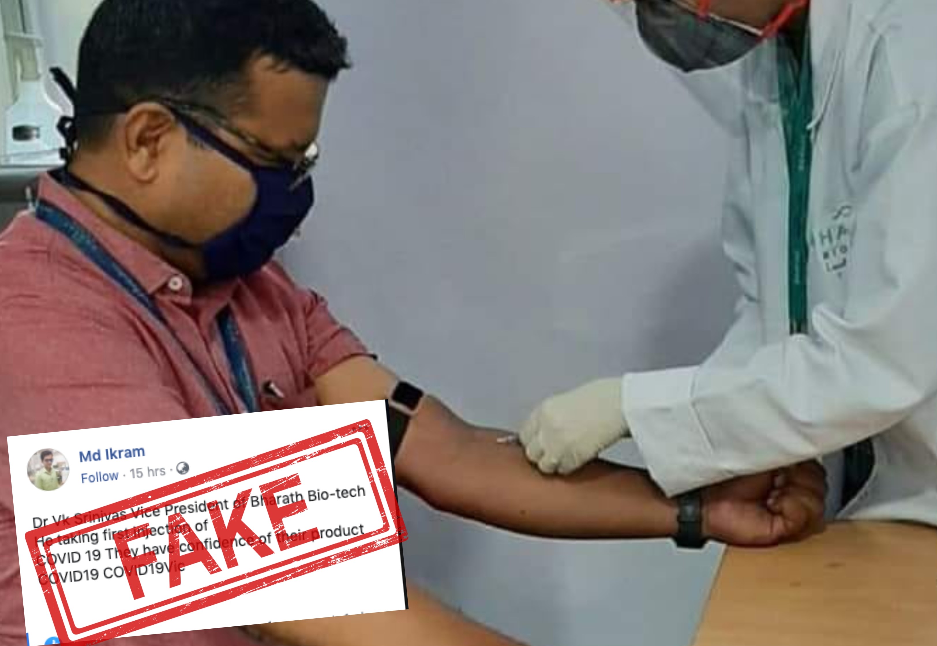 भारत बायोटेक द्वारा COVID-19 वैक्सीन के बारे में खबर सामने आने के तुरंत बाद, एक तस्वीर सोशल मीडिया पर साझा की की जा रही जिसमें मास्क में एक व्यक्ति को मेडिकल स्टाफ से एक इंजेक्शन शॉट लेते देखा जा सकता है। यह दावा किया गया है कि तस्वीर में दिख रहा आदमी भारत बायोटेक के उपाध्यक्ष डॉ। वीके श्रीनिवास है और वह COVID-19 (वैक्सीन) का पहला इंजेक्शन ले रहा है।