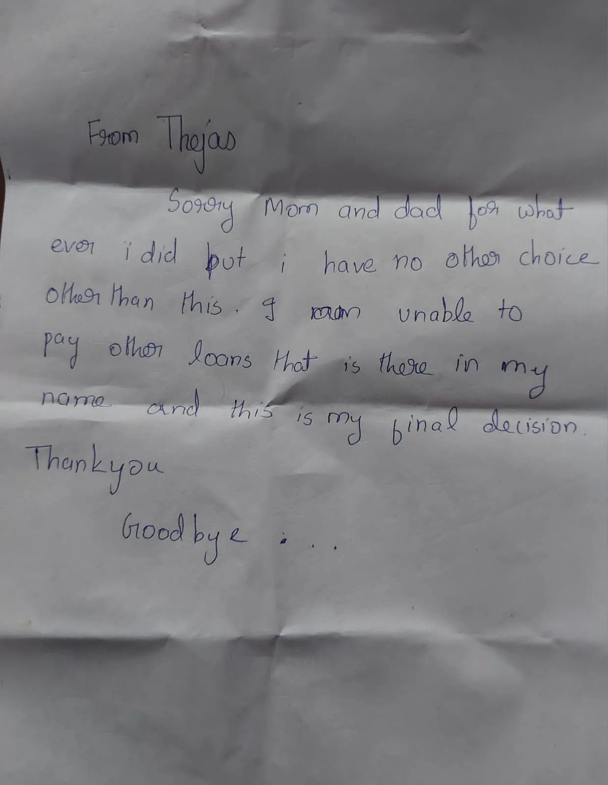 सूत्रों द्वारा मिली जनकारी के मुताबिक तेजस के परिवार ने कहा कि उसने चीनी ऐप ‘स्लाइस एंड किस’ से कुछ पैसे उधार लिए थे. आरोप लगाया गया कि मोबाइल ऐप के एजेंटों ने तेजस के घर का दौरा किया, डराने-धमकाने के हथकंडे अपनाए और धमकी भरे फोन कॉल किए. तेजस की मौत से तीन दिन पहले गोपीनाथ ने बकाया कर्ज चुकाने के लिए अतिरिक्त समय मांगा था, लेकिन कर्जदाता सहमत नहीं हुआ.