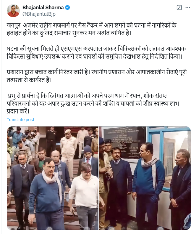 इस मामले को लेकर राजस्थान के मुख्यमंत्री भजनलाल शर्मा ने ट्वीट कर कहा, “जयपुर-अजमेर राष्ट्रीय राजमार्ग पर गैस टैंकर में आग लगने की घटना में नागरिकों के हताहत होने का दुःखद समाचार सुनकर मुझे गहरा दुख हुआ है। घटना की जानकारी मिलते ही मैंने SMS अस्पताल जाकर चिकित्सकों को तत्काल आवश्यक चिकित्सा सुविधाएं उपलब्ध कराने तथा घायलों की उचित देखभाल के निर्देश दिए हैं। प्रशासन द्वारा बचाव कार्य जारी है। स्थानीय प्रशासन एवं आपातकालीन सेवाएं पूरी तत्परता से कार्य कर रही हैं। मैं ईश्वर से प्रार्थना करता हूं कि दिवंगत आत्माओं को अपने परमधाम में स्थान दें, शोकाकुल परिवारों को यह अपार दुःख सहन करने की शक्ति प्रदान करें तथा घायलों को शीघ्र स्वास्थ्य लाभ प्रदान करें।”