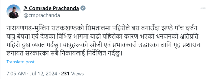 नेपाल के प्रधानमंत्री पुष्प कमल दहल ने ट्वीट किया, “नारायणगढ़-मुग्लिन सड़क खंड पर भूस्खलन में बस के बह जाने से लगभग पांच दर्जन यात्रियों के लापता होने की रिपोर्ट और देश के विभिन्न हिस्सों में बाढ़ और भूस्खलन के कारण संपत्तियों के नुकसान से मैं बहुत दुखी हूं. मैं गृह प्रशासन सहित सरकार की सभी एजेंसियों को यात्रियों की खोज और प्रभावी बचाव के निर्देश देता हूं.”