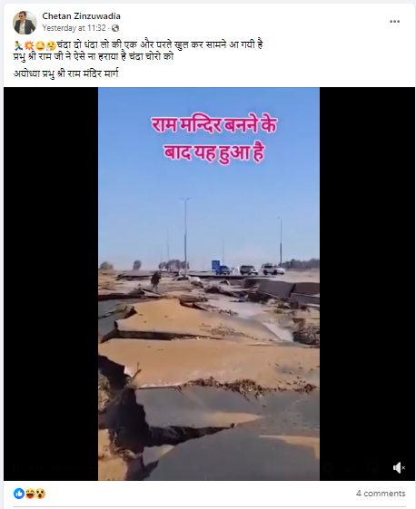 फेसबुक पर वायरल वीडियो शेयर कर हिंदी भाषा के कैप्शन में लिखा गया है कि “चंदा दो धंदा लो की एक और परते खुल कर सामने आ गयी है। प्रभु श्री राम जी ने ऐसे ना हराया है चंदा चोरो को अयोध्या प्रभु श्री राम मंदिर मार्ग”