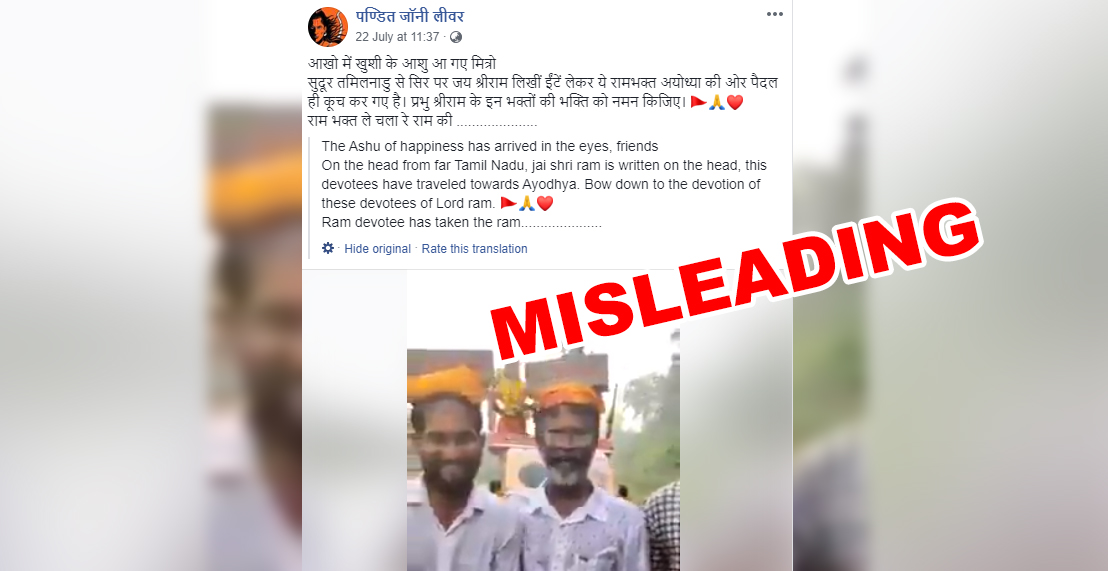 देश में भव्य राम मंदिर का निर्माण जल्द ही होने वाला है। इसी उत्साह के बीच सोशल मीडिया पर एक पोस्ट वायरल हो रहा है। दरअसल पोस्ट में एक वीडियो है। वीडियो में कुछ लोग अपने सिर पर ईंट ले जाते हुए दिखाई दे रहे है जिसमें दावा किया जा रहा है कि ये लोग तमिलनाडु से अयोध्या के लिए चले थे।