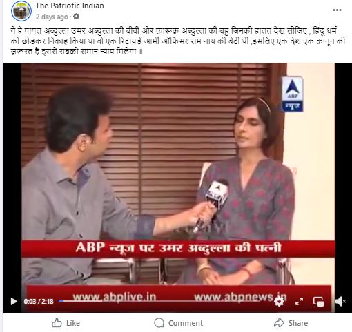 फेसबुक पर वायरल वीडियो को शेयर कर हिंदी भाषा के कैप्शन में लिखा गया है कि “ये है पायल अब्दुल्ला उमर अब्दुल्ला की बीवी और फ़ारूक़ अब्दुल्ला की बहु जिनकी हालत देख लीजिए , हिंदू धर्म को छोड़कर निकाह किया था वो एक रिटायर्ड आर्मी ऑफिसर राम नाथ की बेटी थी ,इसलिए एक देश एक क़ानून की ज़रूरत है इससे सबको समान न्याय मिलेगा।”