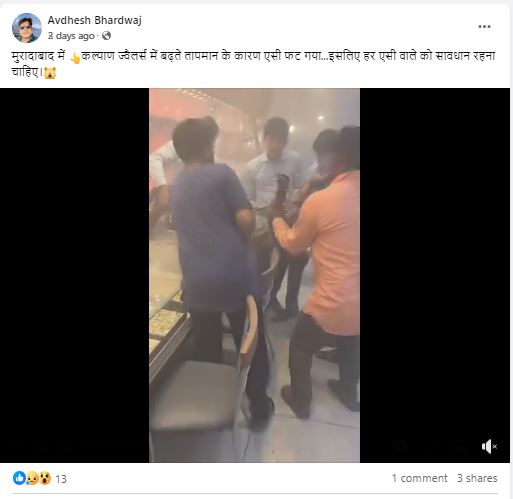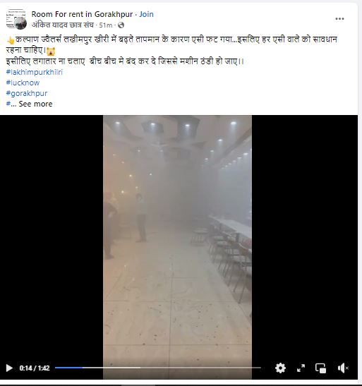 सोशल मीडिया पर एक वीडियो तेजी से वायरल हो रहा है। वीडियो में लोगों को धुएं से भरी एक इमारत से अस्त –व्यस्त हालत में बाहर निकलते हुए देखा जा सकता है। इसी वीडियो को सोशल मीडिया पर शेयर कर दावा किया जा रहा है कि एक ज्वेलर्स शॉप में AC का कंप्रेसर फट जाने से आग लग गई। बता दें कि वायरल वीडियो देश के अलग-अलग शहरों का बताते हुए यह शेयर किया जा रहा है। फेसबुक पर वायरल इस वीडियो को मुरादाबाद, भोपाल व लखीमपुर का बताते हुए शेयर किया जा रहा है।