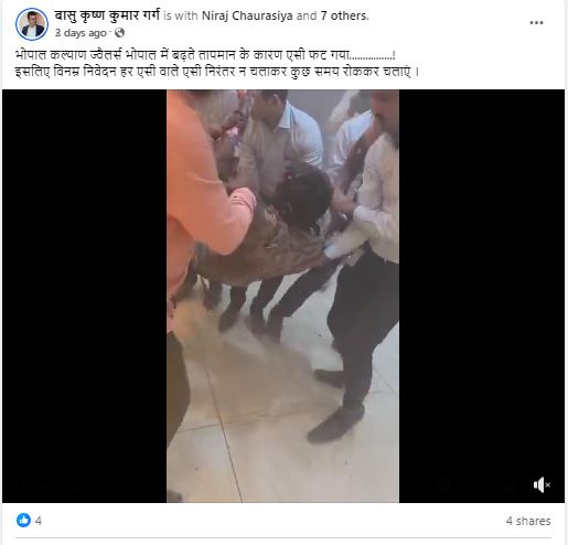 - “भोपाल में कल्याण ज्वैलर्स में बढ़ते तापमान के कारण एसी फट गया…इसलिए हर एसी वाले को सावधान रहना चाहिए।“