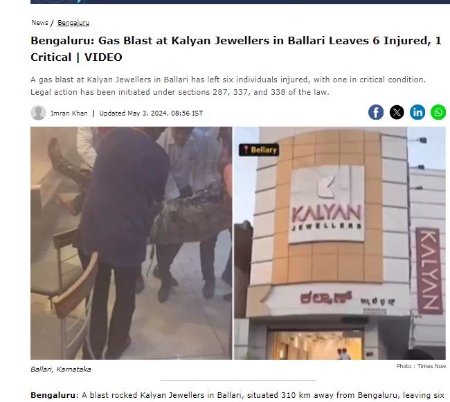 On 2nd May an accidetal blast happened during repair of Air Conditioner in Kalyan Jewellers shop in Brucepete, Ballari. Five persons got injured. A case was registered for negligence. It is warned legal action will be initiated on people spreading misinformation in this regard.