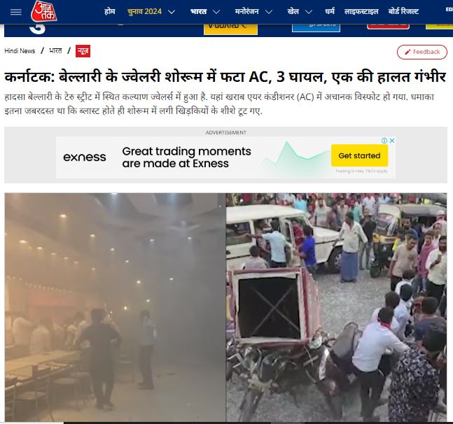 यहाँ भी वायरल वीडियो की जानकारी देते हुए बताया गया है कि 2 मई (गुरुवार) को कर्नाटक के बेल्लारी शहर के कल्याण ज्वैलर्स स्टोर के भीतर एयर कंडीशनर में विस्फोट हो गया।