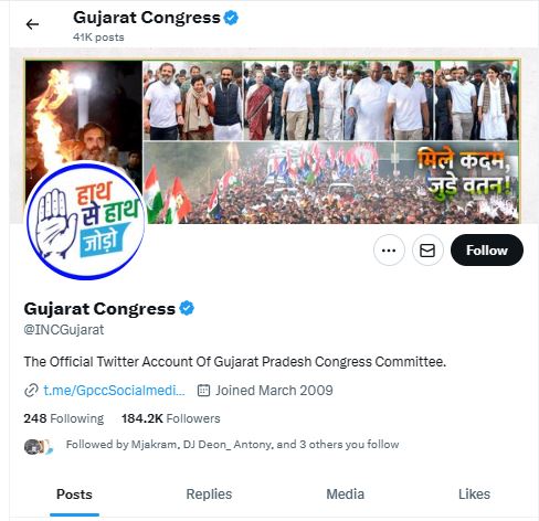 इसके बाद पुष्टि के लिए हमने प्लेटफॉर्म एक्स पर गुजरात कांग्रेस के आधिकारिक हैंडल पर खंगालना शुरू किया। यहाँ भी हमें वायरल दावे से संबंधित कोई जानकारी नहीं मिली। यदि भारत के मौजूदा प्रधानमंत्री नरेंद्र मोदी की धर्मपत्नी कांग्रेस में शामिल होती तो यह गुजरात कांग्रेस के आधिकारिक प्रोफाइल पर जरूर होता।