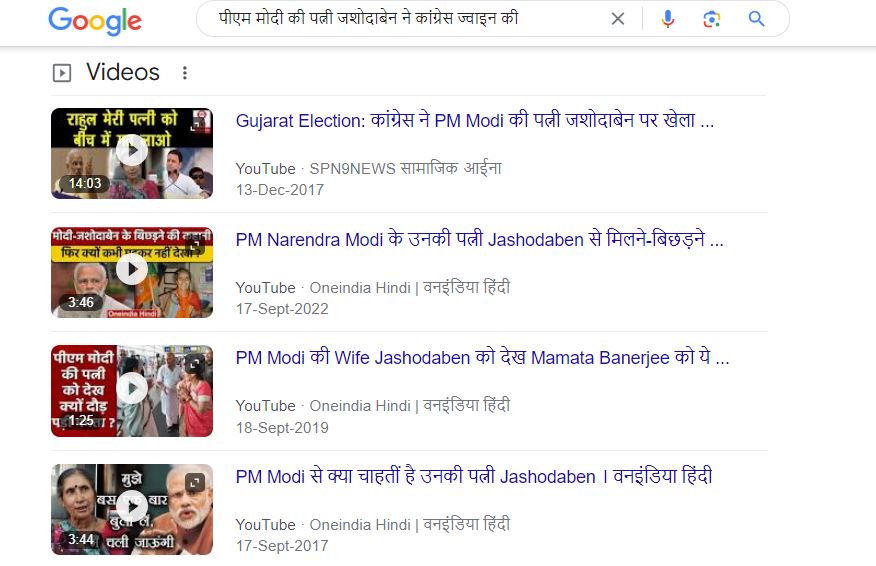 सोशल मीडिया पर वायरल हो खबर की सच्चाई जानने के लिए हमने पड़ताल की। चूंकि यह खबर इतनी बड़ी है कि सभी मीडिया एजेंसियों ने इसे तर्जी दी होगी, इसलिए हमने कुछ संबंधित कीवर्ड्स के माध्यम से हमने गूगल पर खोजना शुरू किया। खोज के दौरान हमें गूगल पर ऐसी कोई खबर नहीं मिली जहां इस बात का जिक्र किया गया हो कि पीएम मोदी की पत्नी जशोदाबेन ने कांग्रेस ज्वाइन कर ली है।