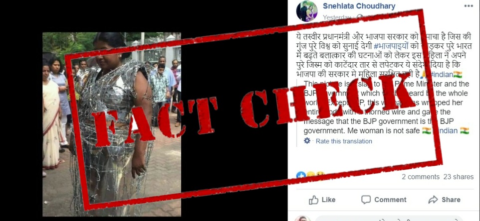 फेसबुक पोस्ट के कैप्शन में लिखा है – “ये तस्वीर प्रधानमंत्री और भाजपा सरकार को तमाचा है जिस की गुंज पुरे विश्व को सुनाई देगी #भाजपाइयों को छोड़कर पुरे भारत मे बढ़ते बलात्कार की घटनाओं को लेकर इस महिला ने अपने पुरे जिस्म को काटेंदार तार से लपेटकर ये संदेश दिया है कि भाजपा की सरकार मे महिला सुरक्षित नही है🙏#indian🇮🇳”