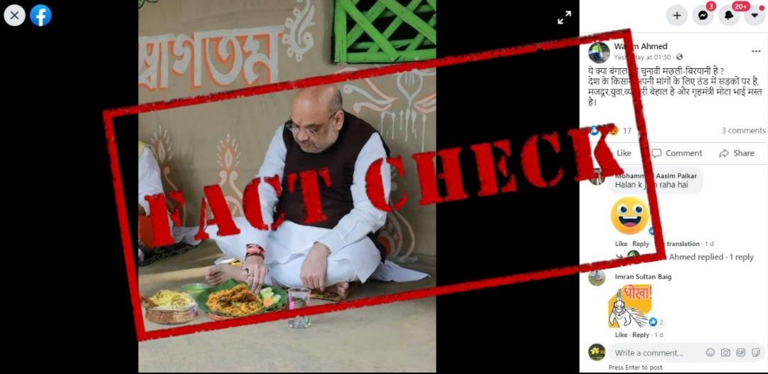मछली और बिरयानी खाते हुए गृह मंत्री अमित शाह की एक तस्वीर सोशल मीडिया पर वायरल हो रही है। तस्वीर में यह दावा किया जा रहा है कि एक तरफ देश के किसान ठंडे सर्दियों में सड़कों पर हैं, अपने अधिकारों के लिए विरोध कर रहे हैं तो वही दूसरी तरफ, गृह मंत्री अमित शाह भोजन का आनंद ले रहे है।