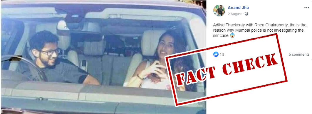 तस्वीर में, महाराष्ट्र के कैबिनेट मंत्री, आदित्य ठाकरे को एक कार के अंदर एक महिला के साथ बैठे देखा जा सकता है। पोस्ट में दावा किया गया है कि तस्वीर में दिख रही महिला अभिनेत्री रिया चक्रवर्ती है। कैप्शन में लिखा है, “इसी वजह से मुंबई पुलिस इस केस की निष्पक्ष जांच करने से डर रही है ”