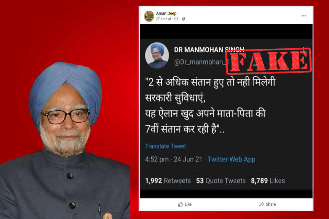 भारत के पूर्व प्रधानमंत्री डॉ मनमोहन सिंह के एक कथित ट्वीट का स्क्रीनशॉट सोशल मीडिया पर वायरल हो गया है, जिसमें दावा किया गया है कि सिंह ने जनसंख्या नियंत्रण विधेयक 2021 को लेकर केंद्र सरकार और प्रधानमंत्री मोदी का मजाक उड़ाया है।
