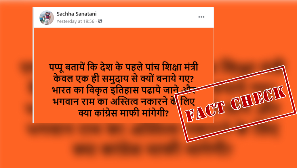फेसबुक में इस पोस्ट के साथ कैप्शन में लिखा है – “पप्पू बतायें कि देश के पहले पांच शिक्षा मंत्री केवल एक ही समुदाय से क्यों बनाये गए? भारत का विकृत इतिहास पढाये जाने और भगवान राम का अस्तित्व नकारने के लिए क्या कांग्रेस माफी मांगेगी? ”