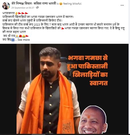 फेसबुक पर वायरल तस्वीर शेयर कर हिंदी भाषा के कैप्शन में लिखा गया है कि “पाकिस्तानी खिलाड़ियों का भगवा गमछा पहनाकर भारत में स्वागत। वर्ल्ड कप खेलने भारत पहुंची है पाकिस्तानी क्रिकेट टीम। पाकिस्तान की टीम वर्ल्ड कप 2023 के लिए 7 साल बाद भारत आयी है उनका स्वागत भी हमारे सनातन धर्म के हिसाब से किया गया सभी पाकिस्तान के खिलाडियों को भगवा गमछा पहनाकर स्वागत किया गया, ये है हिन्दू राष्ट्र की तरफ बढ़ता भारत”