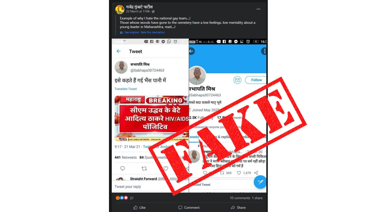 महाराष्ट्र के मुख्यमंत्री और शिवसेना के नेता उद्धव ठाकरे के बेटे आदित्य ठाकरे को लेकर सोशल मीडिया में एक आपत्तिजनक दावा साझा किया जा रहा है। दरअसल फेसबुक पर वायरल पोस्ट में दावा किया जा रहा है कि आदित्य ठाकरे एचआईवी पॉजिटिव हो गए हैं। कुछ यूज़र्स ने इसे शेयर करते हुए लिखा – गयी … Continue reading फैक्ट चेक : क्या महाराष्ट्र सीएम के बेटे आदित्य ठाकरे हुए HIV पॉजिटिव? जानें सच