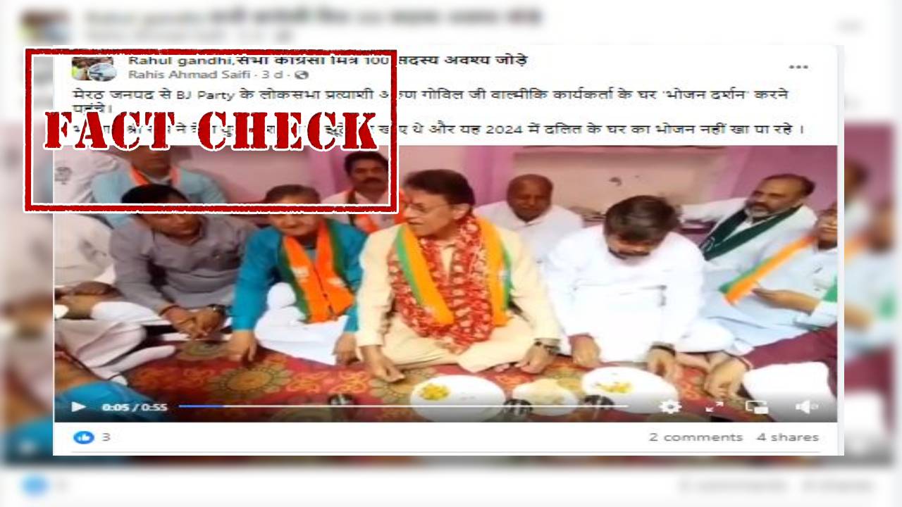 इसी वीडियो को सोशल मीडिया पर शेयर कर दावा किया जा रहा मेरठ के भाजपा प्रत्याशी अरुण गोविल एक दलित के घर तो गए लेकिन वहाँ खाना नहीं खाया। फेसबुक पर वायरल वीडियो को शेयर कर हिंदी भाषा के कैप्शन में लिखा गया है कि “मेरठ जनपद से BJ Party के लोकसभा प्रत्याशी अरुण गोविल जी वाल्मीकि कार्यकर्ता के घर ‘भोजन दर्शन’ करने पहुंचे। भगवान श्री राम ने त्रेता युग में शबरी के झूठे बेर खाए थे और यह 2024 में दलित के घर का भोजन नहीं खा पा रहे।”