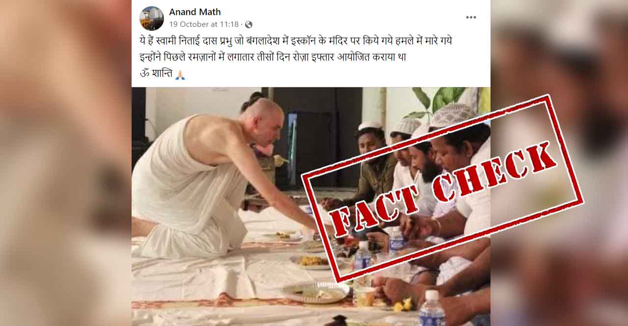 एक फेसबुक पोस्ट में लिखा है कि, “ये हैं स्वामी निताई दास प्रभु जो बंगलादेश में इस्कॉन के मंदिर पर किये गये हमले में मारे गये इन्होंने पिछले रमज़ानों में लगातार तीसों दिन रोज़ा इफ्तार आयोजित कराया था ॐ शान्ति.”