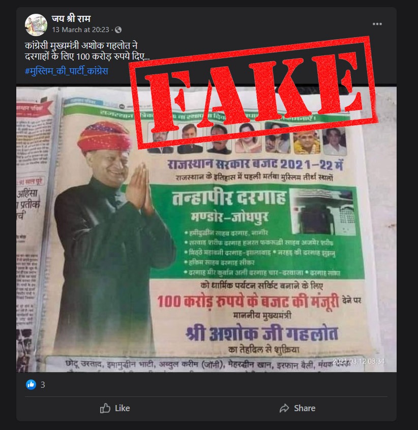 फेसबुक पर एक यूज़र ने इस विज्ञापन को साझा करते हुए लिखा – कांग्रेसी मुख्यमंत्री अशोक गहलोत ने दरगाहों के लिए 100 करोड़ रुपये दिए…
