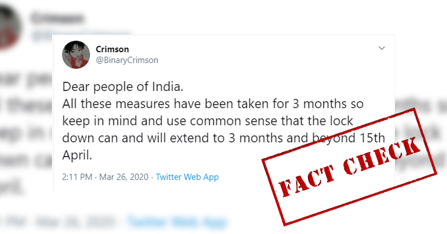 All these measures have been taken for 3 months so keep in mind and use common sense that the lock down can and will extend to 3 months and beyond 15th April.— Crimson (@BinaryCrimson) March 26, 2020