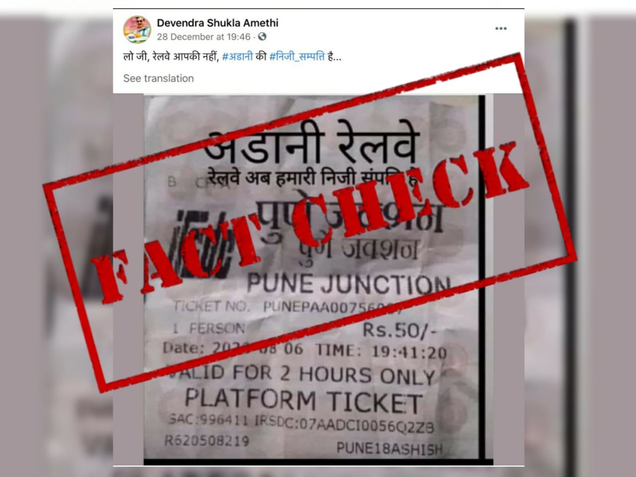 पुणे जंक्शन के एक प्लेटफॉर्म टिकट की तस्वीर जिस पर ’अदानी’ लिखा है, सोशल मीडिया पर वायरल हो रही है। सोशल मीडिया उपयोगकर्ताओं का दावा है कि भारतीय रेलवे अब उद्योगपति अदानी की निजी संपत्ति है।