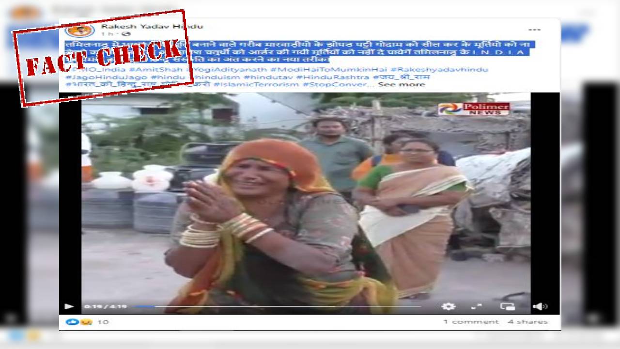 फेसबुक का पोस्ट कुछ इस प्रकार है,’तमिलनाडु में भगवान कि मूर्ति बनाने वाले गरीब मारवाड़ीयो के झोपड पट्टी गोदाम को सील कर के मूर्तियो को ना बेचने का नोटिस दिया अब गणेश चतुर्थी को आर्डर की गयी मूर्तियों को नहीं दे पायेगें तमिलनाडु के I. N. D. I. A मुख्यमंत्री का ऐलान हिन्दू संस्कृति का अंत करने का नया तरीका’