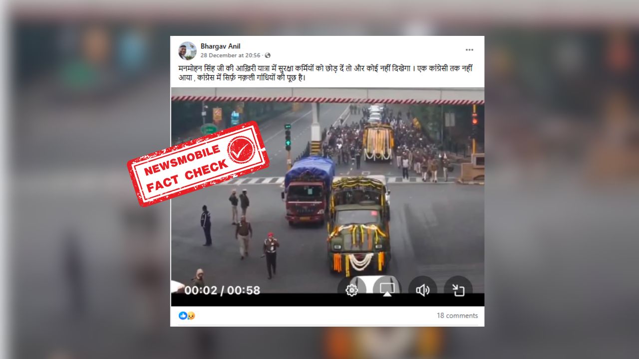 फेसबुक पर वायरल वीडियो शेयर कर हिंदी भाषा के कैप्शन में लिखा गया है कि “मनमोहन सिंह जी की आख़िरी यात्रा में सुरक्षा कर्मियों को छोड़ दें तो और कोई नहीं दिखेगा । एक कांग्रेसी तक नहीं आया , कांग्रेस में सिर्फ़ नक़ली गांधियों की पूछ है।”