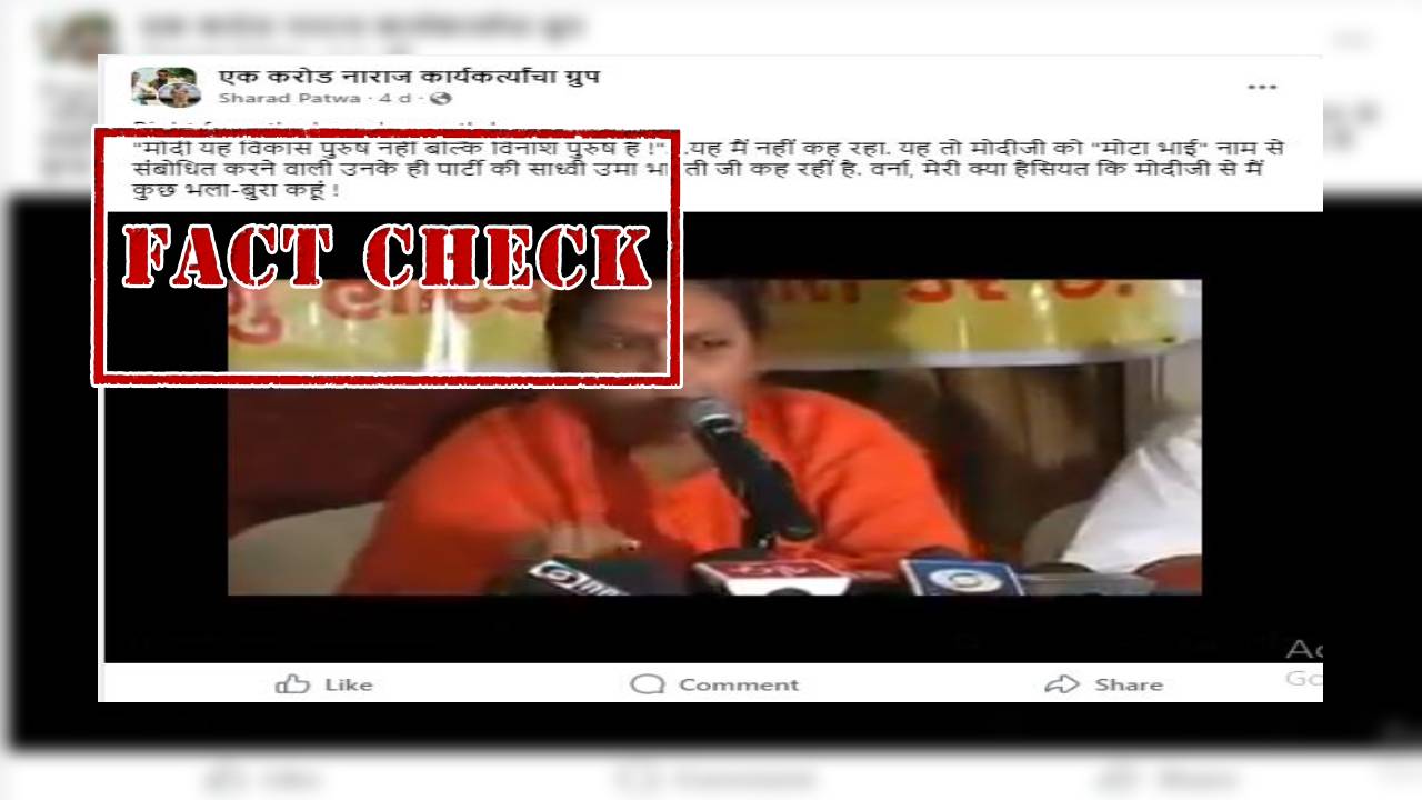 फेसबुक पर वायरल वीडियो को शेयर कर हिंदी भाषा के कैप्शन में लिखा कि ‘उमा भारती ने कहा नरेंद्र मोदी विकास नहीं, विनाश पुरुष हैं।’