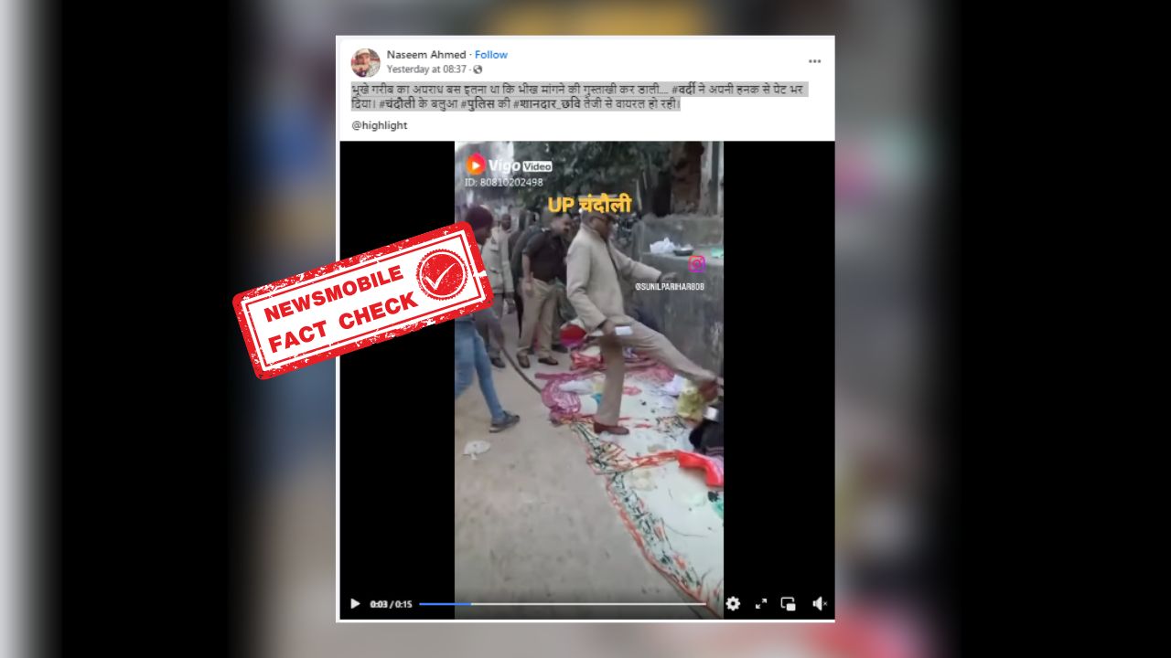 फेसबुक पर वायरल वीडियो को शेयर कर हिंदी भाषा के कैप्शन में लिखा गया है कि ‘भूखे गरीब का अपराध बस इतना था कि भीख मांगने की गुस्ताखी कर डाली…. वर्दी ने अपनी हनक से पेट भर दिया। चंदौली के बलुआ पुलिस की शानदार_छवि तेजी से वायरल हो रही।
