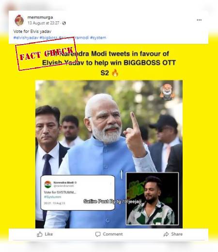 सोशल मीडिया पर एक पोस्ट को शेयर करते हुए दावा किया जा रहा है कि बिग बॉस प्रतियोगिता में एल्विस यादव को वोट करने के लिए प्रधानमंत्री नरेंद्र मोदी ने लोगों से अपील की थी। फेसबुक पोस्ट इस प्रकार है ‘Vote For Elvis Yadav’