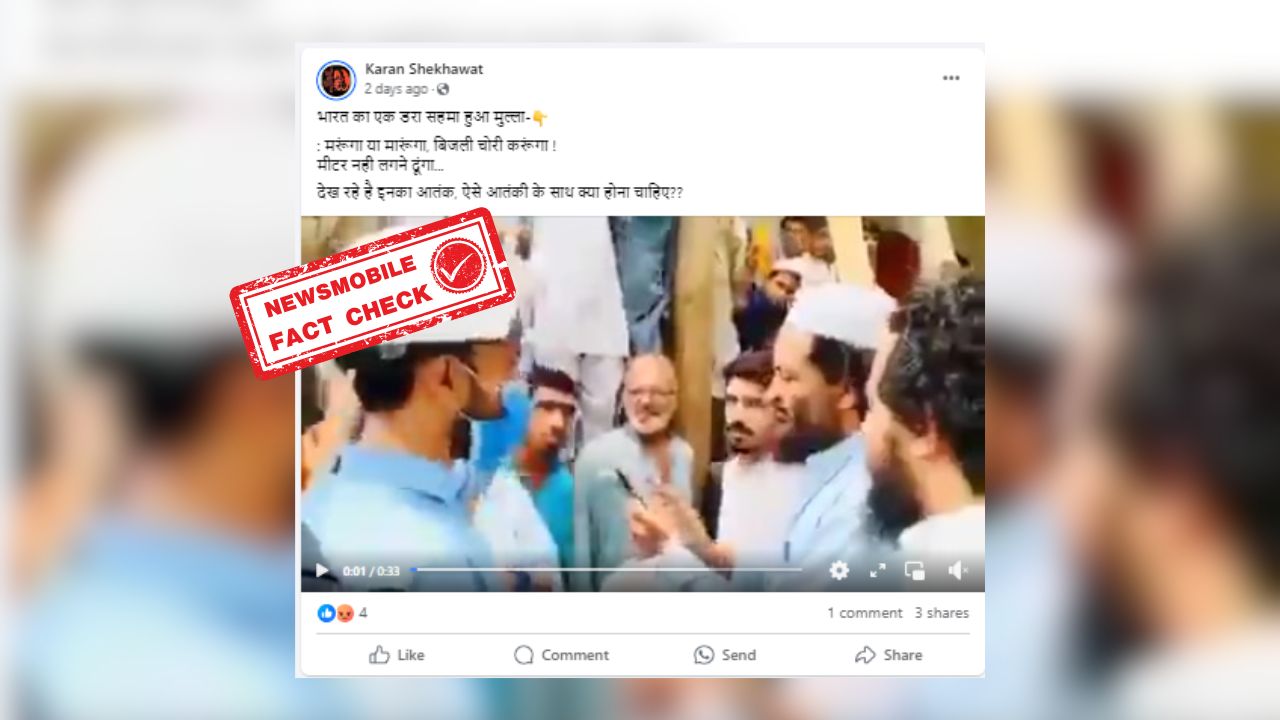सोशल मीडिया पर एक वीडियो तेजी से वायरल हो रहा है, वीडियो में समुदाय विशेष की सफेद टोपी लगाए हुए एक व्यक्ति को मास्क लगाए एक अन्य व्यक्ति से बिजली बिजली चोरी की बात खुद कबूलते करते हुए दिखाई दे रहा है, इस दौरान सफेद टोपी लगाए हुए व्यक्ति को वार्तालाप में मरने, मारने की बात करते हुए भी सुना जा सकता है। इसी वीडियो को सोशल मीडिया पर शेयर कर दावा किया जा रहा है कि “यह वीडियो भारत का है, जहां समुदाय विशेष के लोग बिजली चोरी करने के बाद मरने मारने की बात कर रहे हैं।”