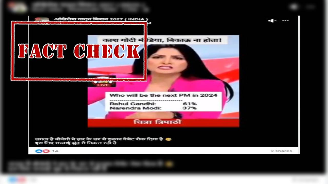 वायरल वीडियो को गौर से देखने पर हमने पाया कि वीडियो का ऑडियो और वीडियो दोनों एक दूसरे से मेल नहीं खा रहे थे। इसलिए वीडियो की सच्चाई जानने के लिए हमने पड़ताल की। पड़ताल के दौरान हमने सबसे पहले कुछ तथ्यों पर गौर किया। इस दौरान हमने गौर किया कि न्यूज़ 24 का अभी तक ऐसा कोई सर्वे सामने नहीं आया है जहां विपक्ष के INDIA गठबंधन को जीत हांसिल होते दिखाई दे रही है। इसके साथ ही हमने गौर किया कि चित्र त्रिपाठी आज तक चैनल की न्यूज़ एंकर हैं, इसलिए अपने बुलेटिन में किसी दूसरे चैनल के सर्वे का जिक्र करना मुमकिन नहीं है।