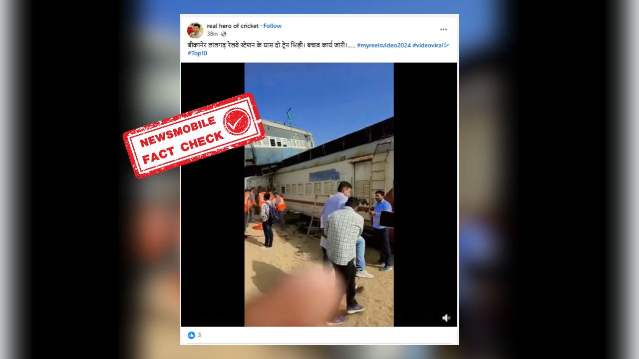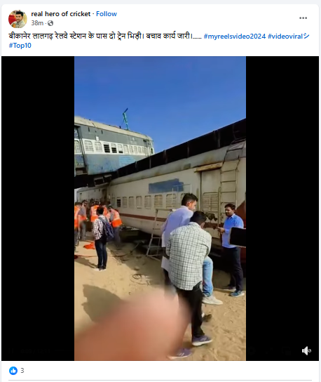 फेसबुक पर वायरल वीडियो को शेयर कर हिंदी भाषा के कैप्शन में “बीकानेर लालगढ़ रेलवे स्टेशन के पास दो ट्रेन भिड़ी। बचाव कार्य जारी।