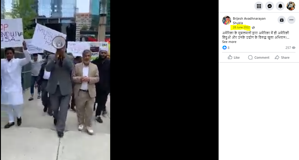 फेसबुक पर वायरल वीडियो शेयर कर हिंदी भाषा के कैप्शन में लिखा गया है कि “शिकागो, अमेरिका में मुसलमान हिंदुओं का बहिष्कार करने के लिए रैलियां निकाल रहे हैं। मुसलमानों से कहा जा रहा है कि हिंदुओं,विशेषकर पटेल समाज की दुकानों से कुछ खरीदारी न करें। शिकागो, अमेरिका में मुसलमानों ने हिंदू दुकानों से किराने का सामान नहीं खरीदने के लिए विरोध प्रदर्शन किया, जो पटेल द्वारा संचालित हैं। क्योंकि वे आरएसएस को फंडिंग कर रहे हैं। “