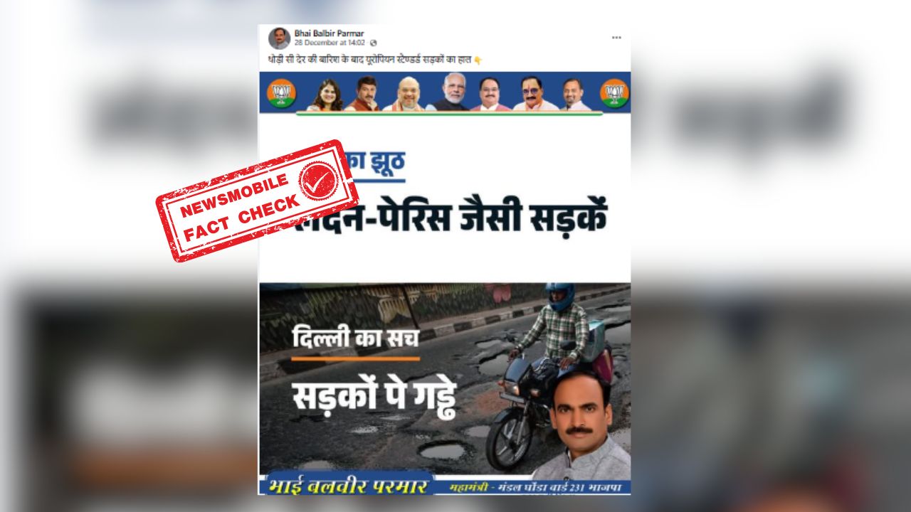 सोशल मीडिया पर एक तस्वीर से वायरल हो रही है जिसमें एक मोटर साइकिल पर सवार एक व्यक्ति को एक ऐसे सड़क से गुजरते हुए देखा जा सकता है जहां गड्ढे ही गड्ढे हैं। इसी तस्वीर को शेयर कर दावा किया जा रहा है यह दिल्ली की सड़क है, जो गड्ढों से भरी हुई है। फेसबुक पर वायरल वीडियो को शेयर कर हिंदी भाषा के कैप्शन में लिखा गया है कि ‘थोड़ी सी देर की बारिश के बाद यूरोपियन स्टैण्डर्ड सड़कों का हाल” आगे तस्वीर पर भी लिखा गया है कि ‘AAP का झूठ लंदन-पैसिस जैसी सड़कें’