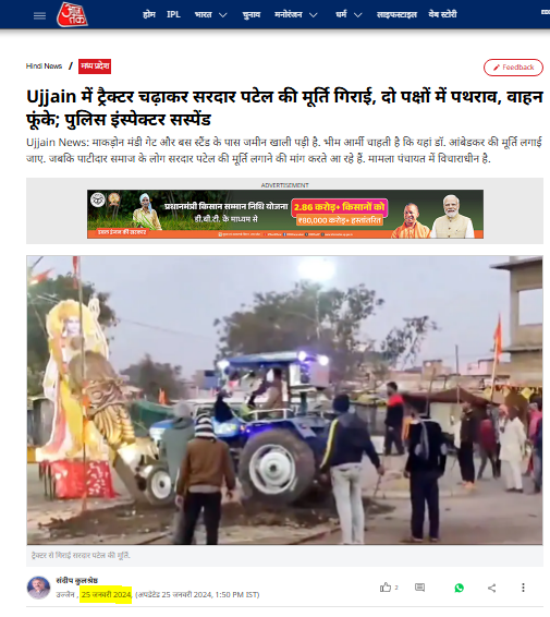 उपरोक्त प्राप्त वीडियो में जानकारी देते हुए बताया गया है कि वायरल वीडियो हालिया दिनों की घटना नहीं बल्कि साल 2024 के दौरान की है, जो उज्जैन जिले के माकड़ोन क्षेत्र में हुई थी। प्राप्त वीडियो में बताया गया है कि उज्जैन में दो महापुरुषों की मूर्ति को लगाने के लिए दो पक्षों में विवाद हुआ था, जिसके बाद एक दूसरे पक्ष ने सरदार पटेल की मूर्ती तोड़ दी।