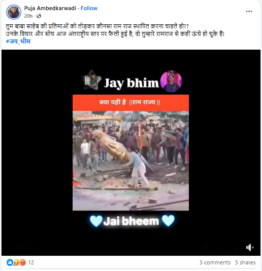 फेसबुक के वायरल पोस्ट को शेयर कर हिंदी भाषा के कैप्शन में लिखा गया है कि “तुम बाबा साहेब की प्रतिमाओं को तोड़कर कौनसा राम राज स्थापित करना चाहते हो?? उनके विचार और सोच आज अंतराष्ट्रीय स्तर पर फैली हुई है, वो तुम्हारे रामराज से कहीं ऊंचे हो चुके हैं!”