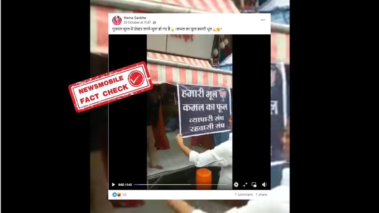 फेसबुक पर वायरल वीडियो को शेयर कर हिंदी भाषा के कैप्शन में लिखा गया है कि ‘गुजरात सूरत में पोस्टर लगने शुरू हो गए हैं *कमल का फूल हमारी भूल’