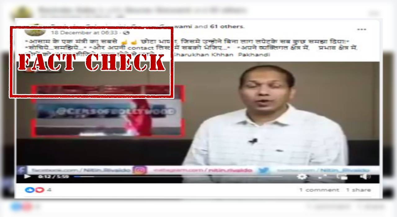 फेसबुक के वायरल वीडियो को शेयर कर हिंदी भाषा के कैप्शन में लिखा गया है कि “आसाम के एक मंत्री का सबसे छोटा भाषण, जिसमे उन्होने बिना लाग लपेटके सब कुछ समझा दिया!* *सोचिये…समझिये…* *और अपनी contact लिस्ट में सबको भेजिए…* *अपने व्यक्तिगत क्षेत्र में, प्रभाव क्षेत्र में, लोगों को जागृत कीजिये…खत्म होने से पहले…* Sharukhan Khhan Pakhandi”