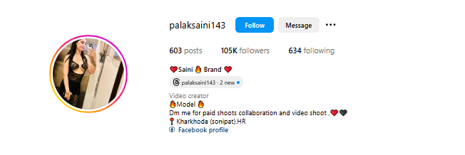 अपनी पड़ताल के दौरान हमें इंस्टग्राम अकाउंट के बायो सेक्शन में दी गयी जानकारी भी मिली, जहां यह बताया गया है कि उक्त अकाउंट पलक सैनी का जो हरियाणा के सोनीपत की रहने वाली हैं, गौरतलब है कि पलक खुद को मॉडल बताती हैं।
