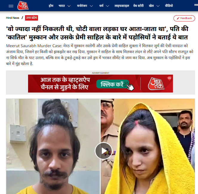 आजतक की रिर्पोर्ट के अनुसार, उत्तर प्रदेश के मेरठ में एक महिला ने अपनी ही पति (सौरभ कुमार) का बेरहमी से कत्ल कर दिया था। खबरों के मुताबिक, सौरभ की पत्नी मुस्कान रस्तोगी ने खाने में नींद की दवा देने के बाद अपने प्रेमी साहिल शुक्ला के साथ मिलकर सौरभ की हत्या की थी और फिर शव के टुकड़े कर उसे एक ड्रम में सीमेंट से बंद कर दिया था। फिलहाल, दोनों पुलिस की गिरफ्त में हैं। मुस्कान के माता-पिता ने अपनी बेटी को फांसी देने की मांग की है।