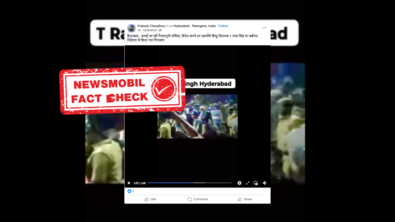 सोशल मीडिया पर एक वीडियो तेजी से वायरल हो रहा है, वीडियो में पुलिस कर्मियों की एक टीम एक नेता को गिरफ्तार करते हुए नजर आ रही है। इसी वीडियो को सोशल मीडिया पर शेयर कर दावा किया जा रहा है कि हैदराबाद में गैरकानूनी तरीके से बनी मस्जिद का विरोध करने पर हैदराबाद पुलिस बीजेपी विधायक टी राजा को गिरफ्तार कर रही है।