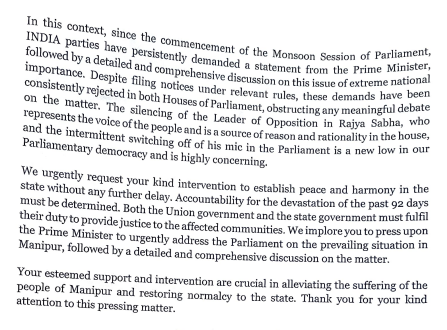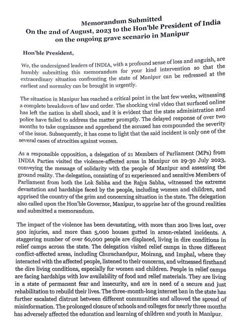 मणिपुर की स्थिति पर विपक्षी गठबंधन I.N.D.I.A द्वारा राष्ट्रपति द्रौपदी मुर्मू को सौंपे गए ज्ञापन में कहा गया, “हम बिना किसी देरी के राज्य में शांति और सद्भाव स्थापित करने के लिए आपसे तत्काल हस्तक्षेप का अनुरोध करते हैं. प्रभावित समुदायों को न्याय प्रदान करने के लिए केंद्र और राज्य सरकार दोनों को अपना कर्तव्य पूरा करना चाहिए. हम आपसे निवेदन करते हैं कि आप प्रधानमंत्री पर मणिपुर की मौजूदा स्थिति पर संसद को तत्काल संबोधित करने के लिए दबाव डालें, जिसके बाद इस मामले पर एक विस्तृत और व्यापक चर्चा हो.”