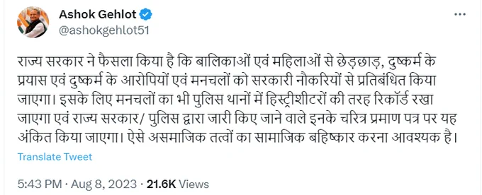 मुख्यमंत्री गहलोत ने कहा कि, राज्य सरकार ने फैसला किया है कि बालिकाओं एवं महिलाओं से छेड़छाड़, दुष्कर्म के प्रयास एवं दुष्कर्म के आरोपियों एवं मनचलों को सरकारी नौकरियों से प्रतिबंधित किया जाएगा. इसके लिए मनचलों का भी पुलिस थानों में हिस्ट्रीशीटरों की तरह रिकॉर्ड रखा जाएगा एवं राज्य सरकार/ पुलिस द्वारा जारी किए जाने वाले इनके चरित्र प्रमाण पत्र पर यह अंकित किया जाएगा. ऐसे असमाजिक तत्वों का सामाजिक बहिष्कार करना आवश्यक है.