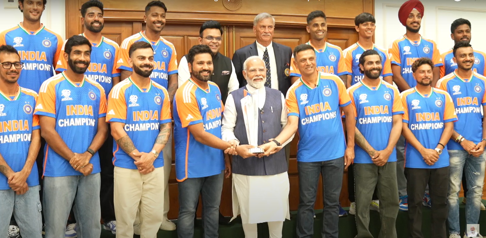 टी20 विश्व कप जीतने के बाद भारत लौटी रोहित शर्मा की अगुआई वाली टीम इंडिया ने आज प्रधानमंत्री नरेंद्र मोदी से उनके आवास पर मुलाकात की। भारतीय क्रिकेट टीम ने प्रधानमंत्री नरेंद्र मोदी से 7, लोक कल्याण मार्ग पर मुलाकात की। 29 जून को बारबाडोस में टी-20 विश्व कप जीतने के बाद टीम इंडिया आज सुबह दिल्ली पहुंची।