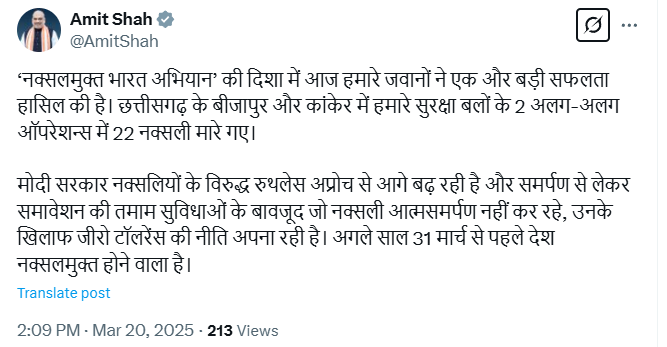 छत्तीसगढ़ में 22 नक्सलियों के मारे जाने पर केंद्रीय गृह मंत्री अमित शाह ने कहा, “नक्सलमुक्त भारत अभियान की दिशा में आज हमारे जवानों ने एक और बड़ी सफलता हासिल की है. छत्तीसगढ़ के बीजापुर और कांकेर में हमारे सुरक्षा बलों के 2 अलग-अलग ऑपरेशन्स में 22 नक्सली मारे गए. मोदी सरकार नक्सलियों के विरुद्ध रुथलेस अप्रोच से आगे बढ़ रही है और समर्पण से लेकर समावेशन की तमाम सुविधाओं के बावजूद जो नक्सली आत्मसमर्पण नहीं कर रहे, उनके खिलाफ जीरो टॉलरेंस की नीति अपना रही है. अगले साल 31 मार्च से पहले देश नक्सलमुक्त होने वाला है.”