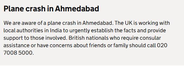 वहीं ब्रिटेन सरकार ने इस दुर्घटना पर ट्वीट करते हुए लिका, हमें अहमदाबाद में हुए विमान हादसे की जानकारी है. ब्रिटेन भारत में स्थानीय अधिकारियों के साथ मिलकर तत्काल तथ्यों को जानने और इसमें शामिल लोगों को सहायता प्रदान करने के लिए काम कर रहा है. जिन ब्रिटिश नागरिकों को वाणिज्य दूतावास संबंधी सहायता की आवश्यकता है या जिन्हें अपने मित्रों या परिवार के बारे में चिंता है, उन्हें 020 7008 5000 पर कॉल करना चाहिए.