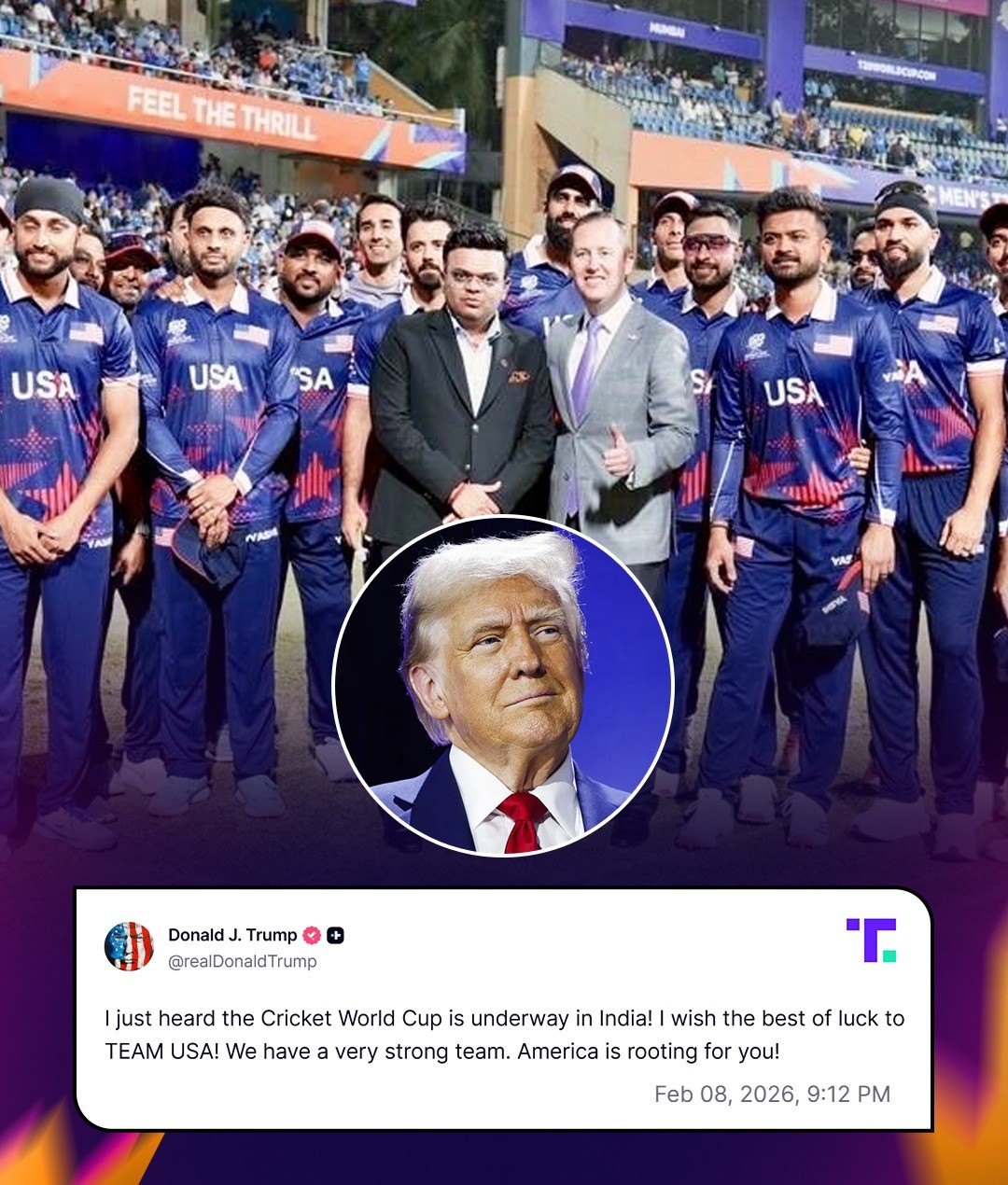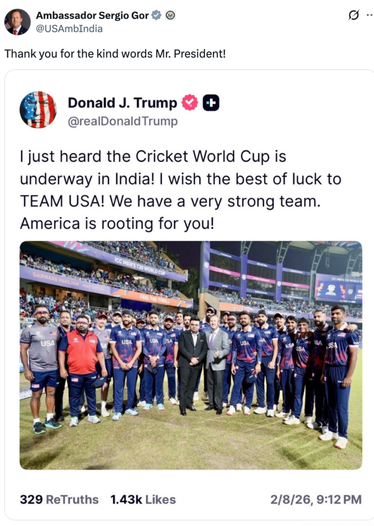 ट्रुथ सोशल पर एक पोस्ट में, ट्रंप ने अमेरिकी टीम पर भरोसा जताते हुए लिखा, “मैंने अभी सुना है कि भारत में क्रिकेट वर्ल्ड कप चल रहा है! मैं टीम USA को शुभकामनाएँ देता हूँ! हमारी टीम बहुत मज़बूत है. पूरा अमेरिका आपको सपोर्ट कर रहा है!”